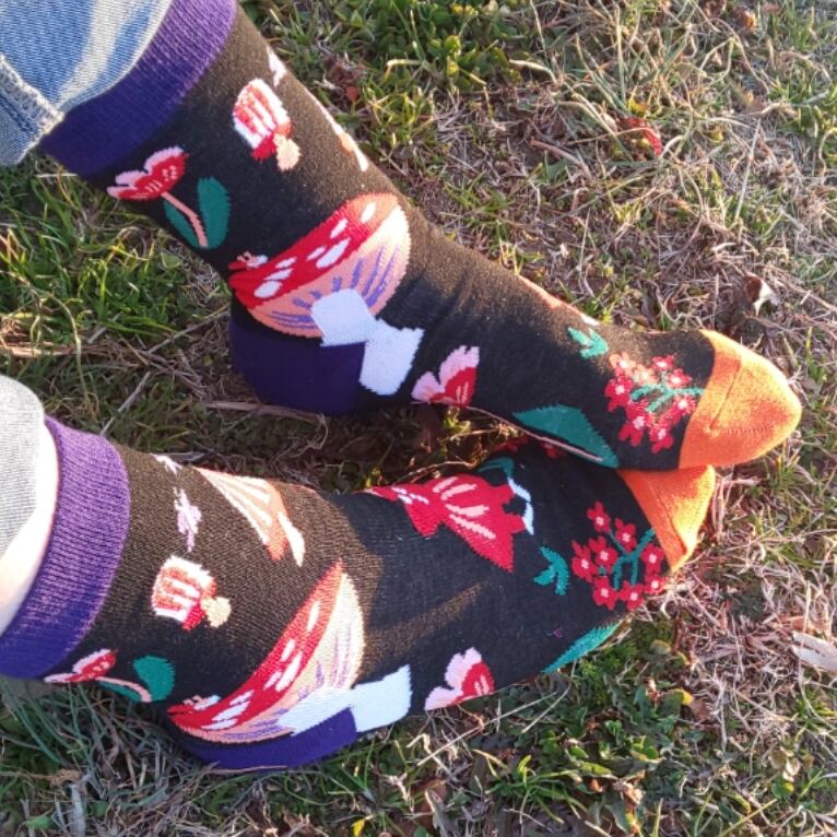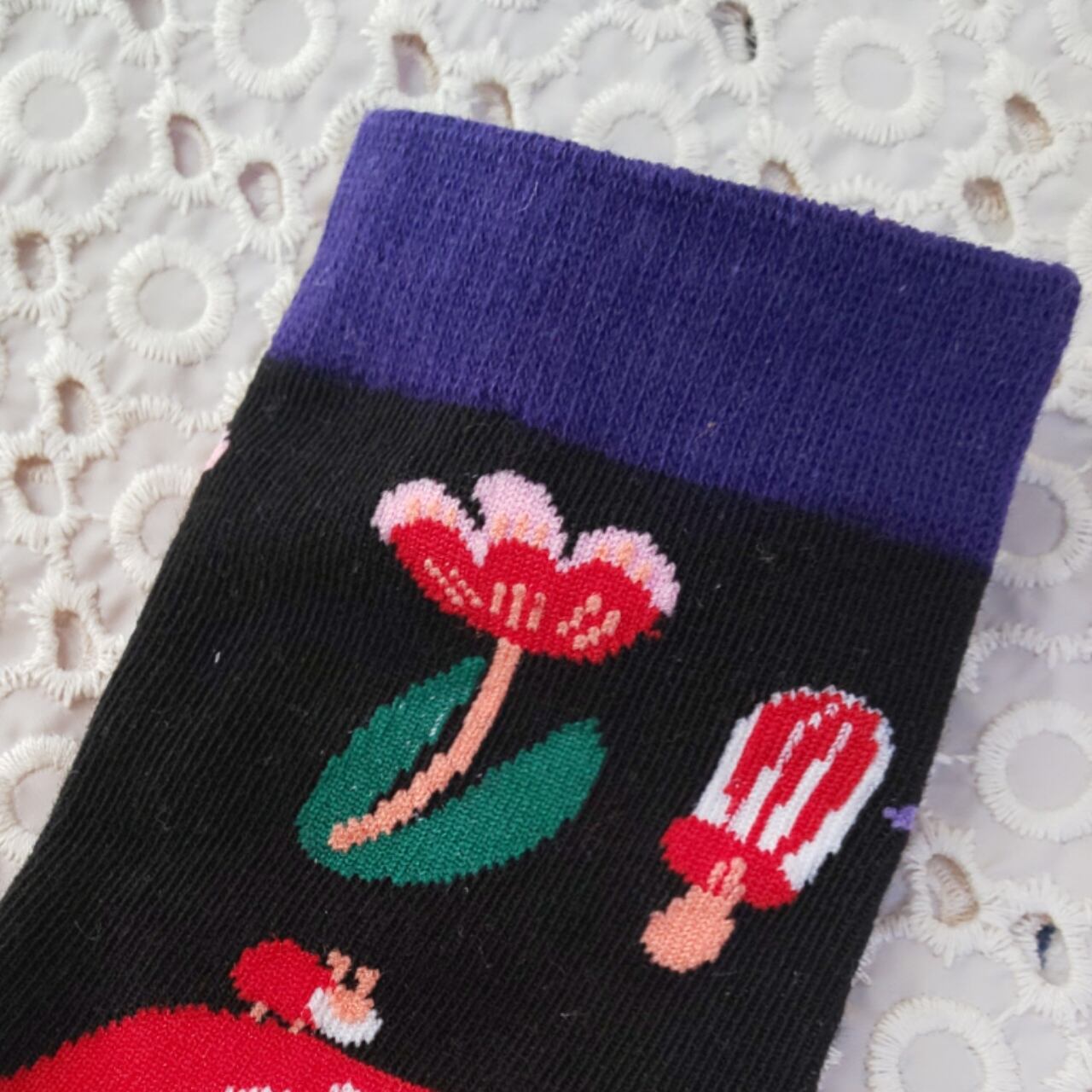 くっきりした色合いがかわいいメルヘンきのこの靴下です。